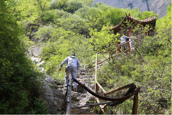 突然“神仙道”三個大字映入眼簾!接近80度、幾乎直上直下的石階擺在面前。盧總大聲提醒“拉開距離,互相照應(yīng),一定要注意安全”,這位頗具男人風(fēng)骨的女強人表現(xiàn)了出奇的冷靜和剛毅。接近垂直的石階無限延伸,好似融入棉絮般的云層,前行者的腳后跟與后隨者的雙手幾乎相連。遠(yuǎn)遠(yuǎn)望去,場面蔚為壯觀,首尾相連,如一條騰空的巨龍,叱咤云夢山!